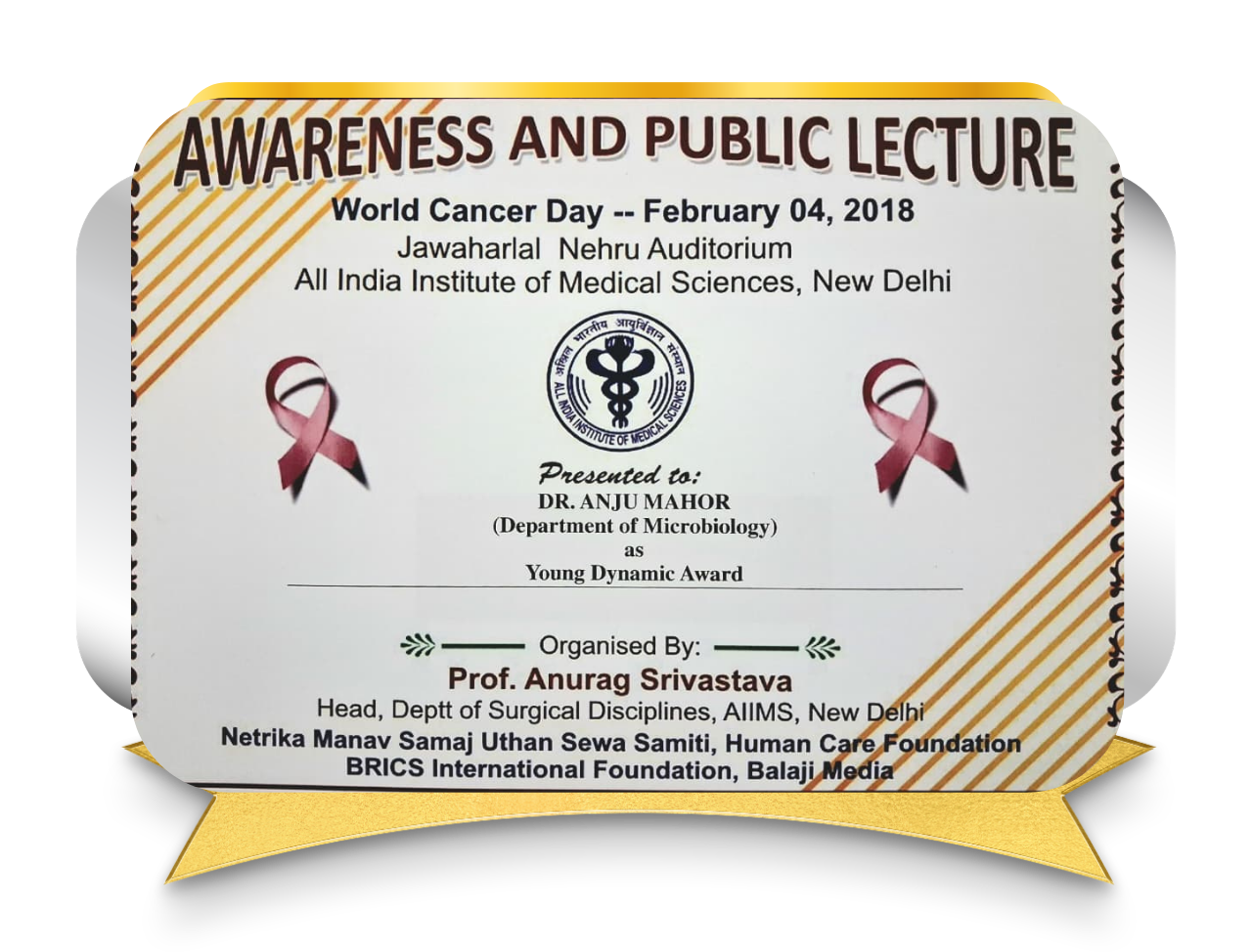Honored with the Young Dynamic Award on the occasion of World Cancer Day at AIIMS, New Delhi. This award recognized her proactive involvement in cancer awareness initiatives, academic engagement, and contribution to public health education.