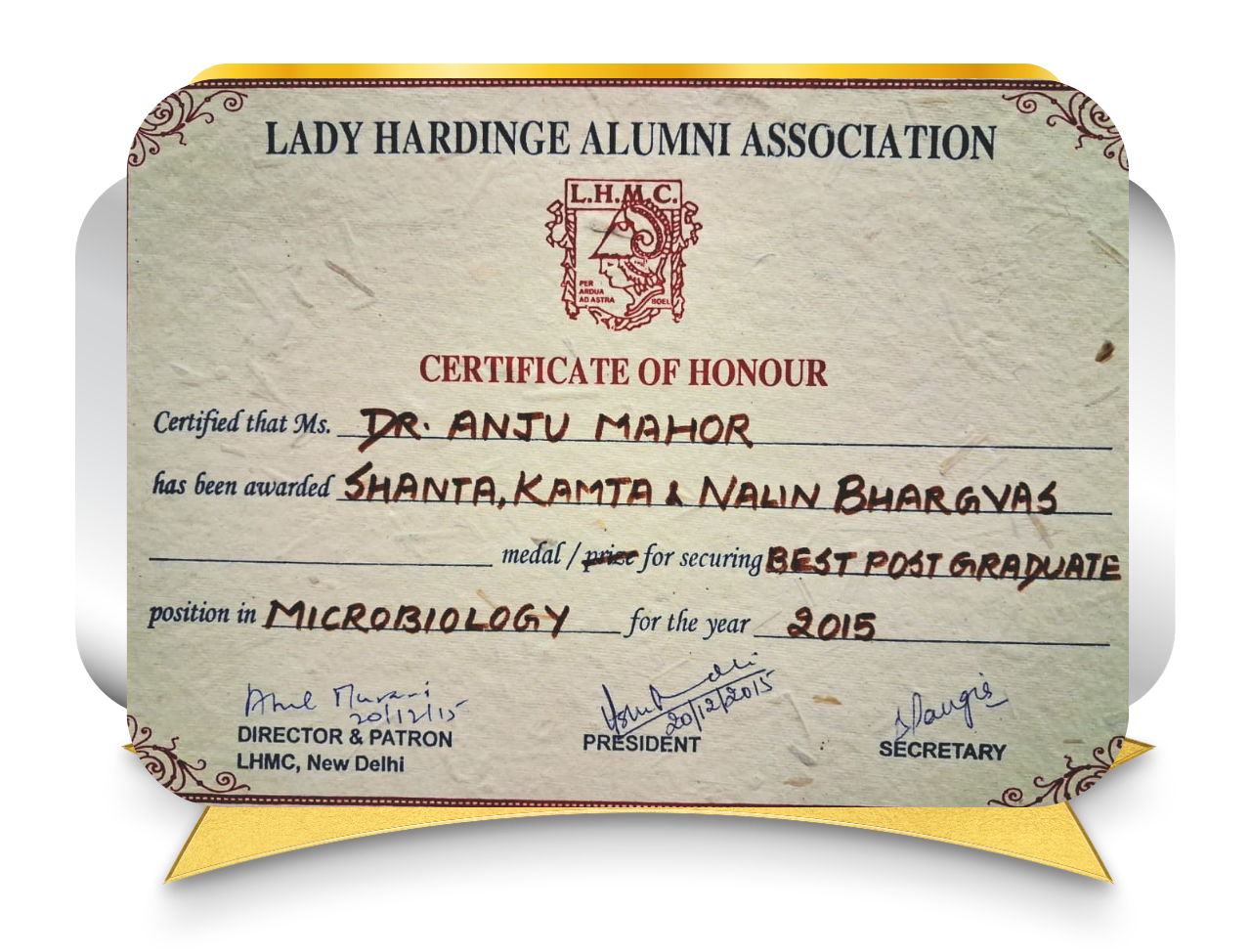 Received the Best Postgraduate Award at Lady Hardinge Medical College, New Delhi, in recognition of academic performance, research work, clinical training, and overall excellence during postgraduate MD Microbiology studies.