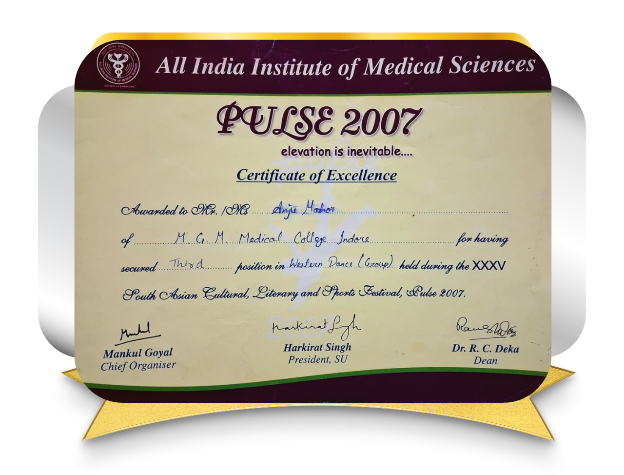 Secured 3rd Prize in Western Dance at Pulse 2007, AIIMS New Delhi. This achievement reflects balanced personal development, creativity, and active participation in cultural events alongside rigorous medical education.
