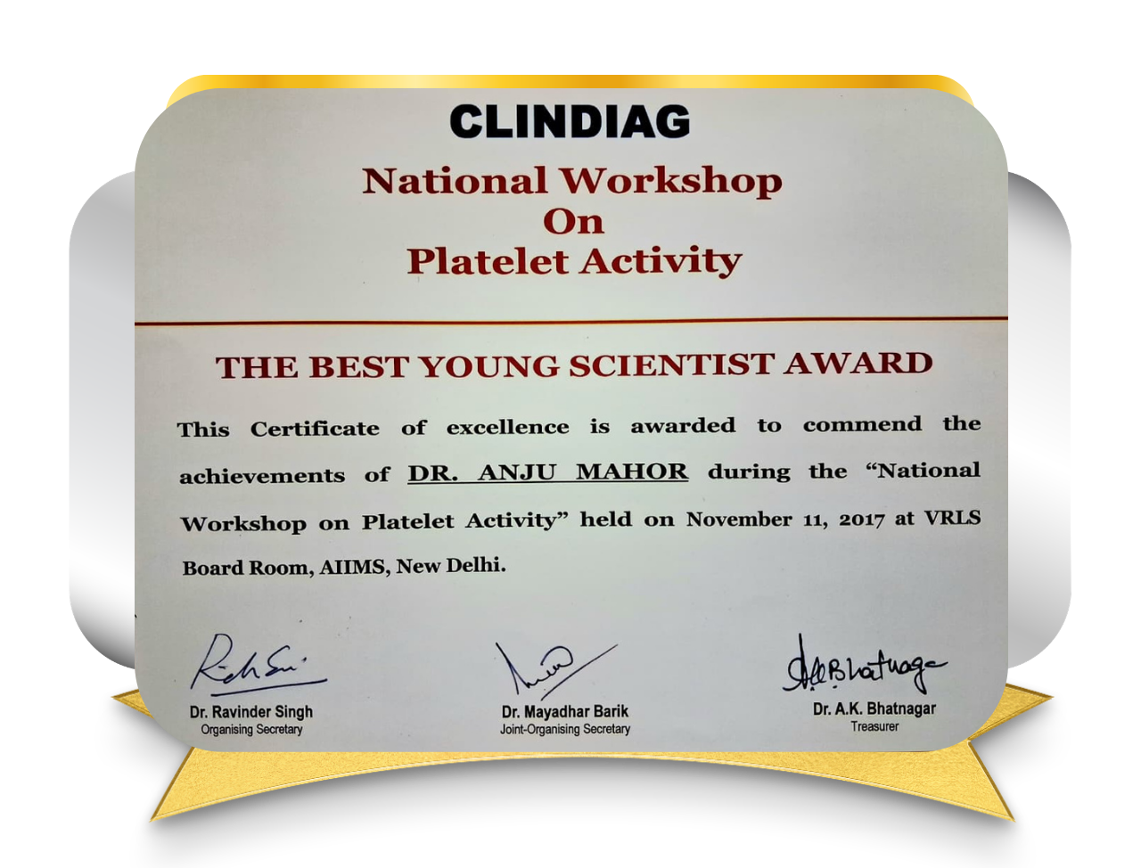 Awarded the Best Young Scientist Award at a national workshop on Platelet Activity held at AIIMS, New Delhi. This recognition was conferred for academic excellence, scientific contribution, and active participation in research-oriented discussions, highlighting early leadership in the field of medical microbiology.